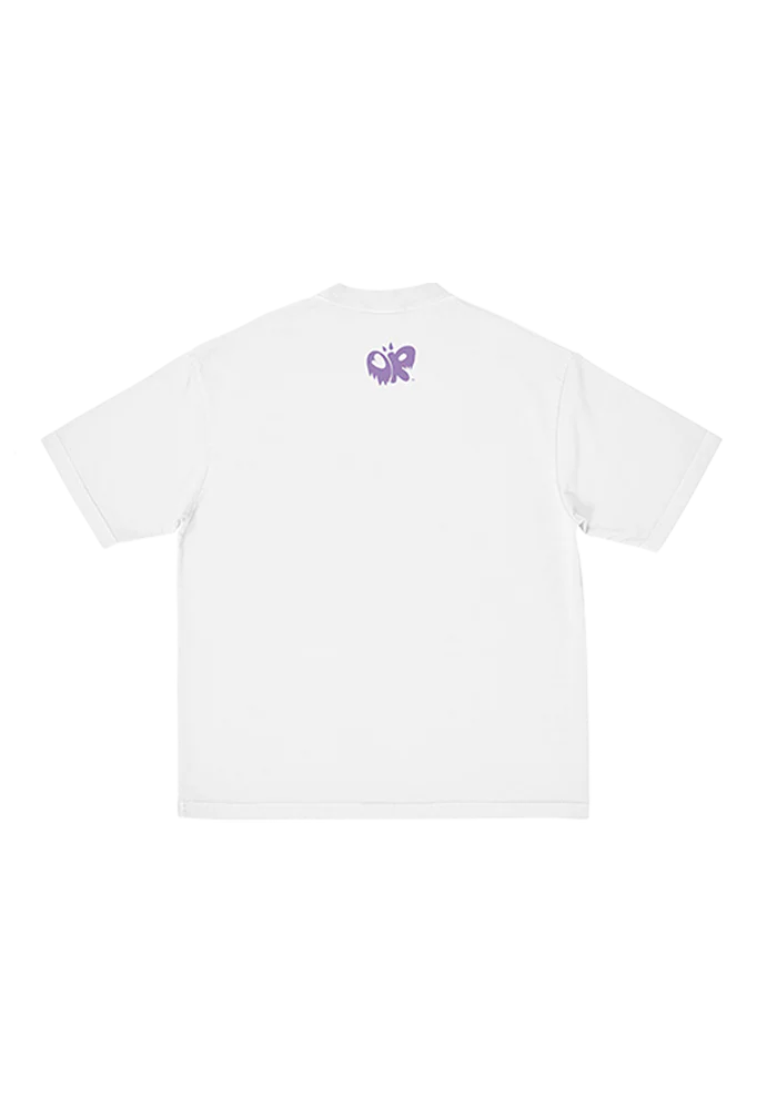 white unisex tee featuring olivia rodrigo “vampire” screen printed graphic in purple