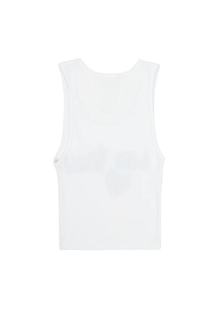 white micro-ribbed crop tank featuring screen-printed olivia rodrigo “bad idea right?” graphic