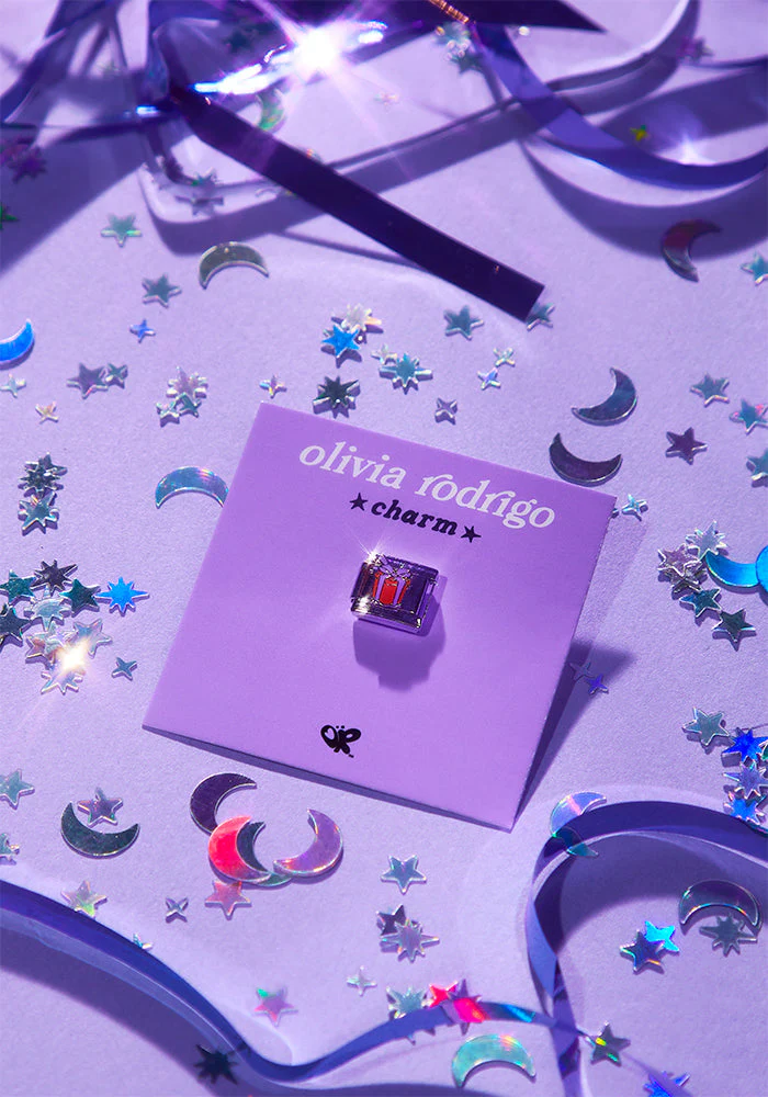 stainless steel charm featuring olivia rodrigo purple and red gift box graphic